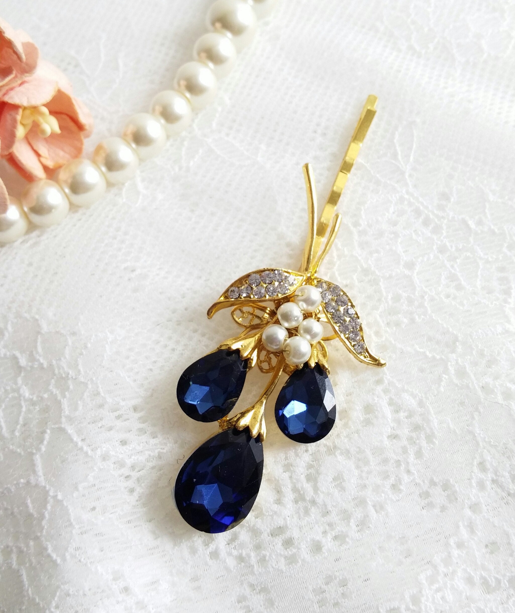 Blue Gold Hair Pin Jewel Flower Hair Clip Sapphire Wedding Etsy Uk