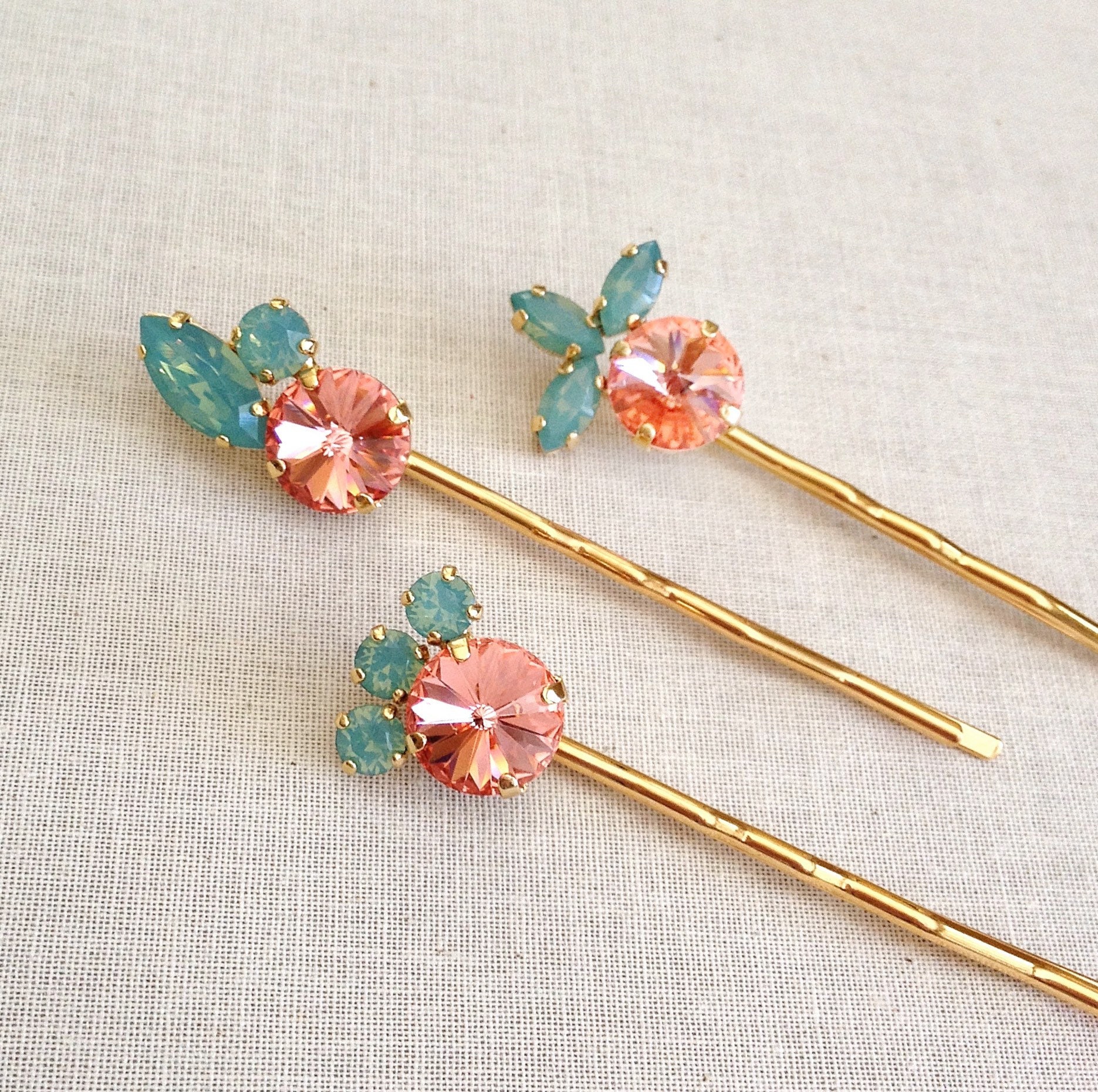Pacific Opal Rose Peach Crystal Hair Pins Crytal Leaf Etsy Uk